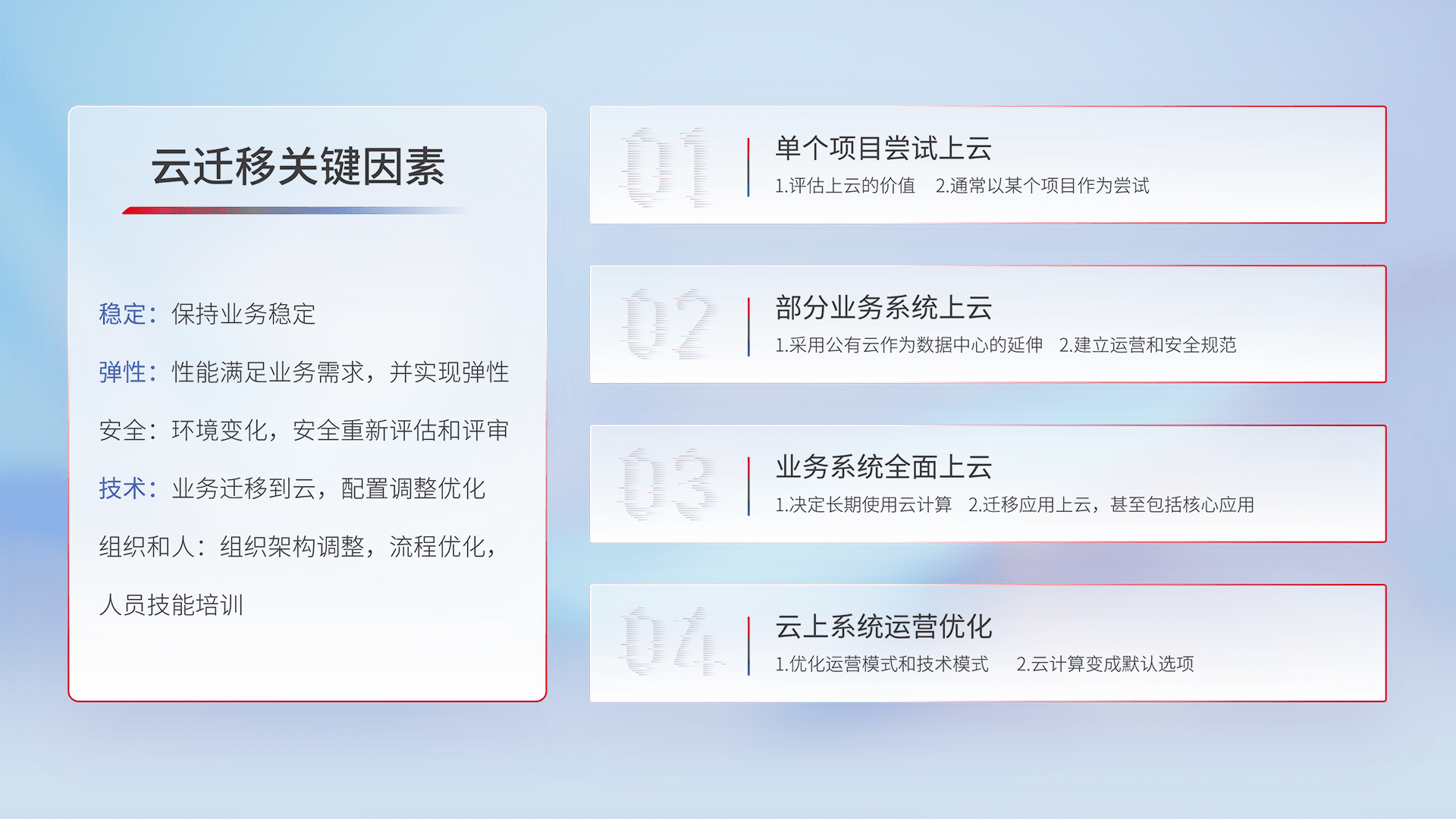 结合实际业务,,,,从规划设计、、、、云平台选型、、、云原生改造、、、数据迁移、、、、集成交付,,,迁移全过程为客户识别最佳上云路径,,,做好风险识别管理,,,,设计网络架构、、、身份权限、、、安全审计合规、、、、操作审计、、、日志审计、、监控告警策略、、、多站点容灾设计等,,对云上基础设施进行整体规划,,提升IT治理水平,,,,以满足弹性、、、高可用、、高性能的需求。。。